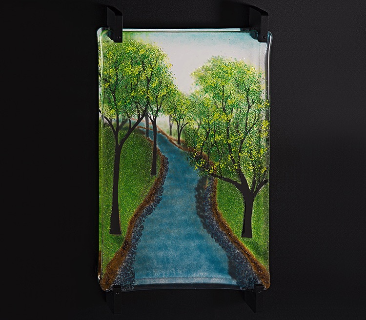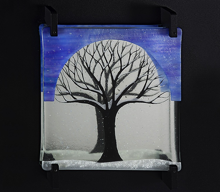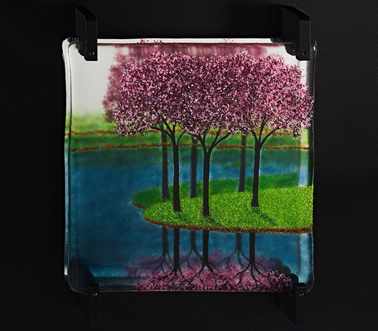 These works are much larger than the others. They are placed in front of a mirror, which has been mounted to a custom-made powder-coated aluminum frame. Both the mirror and the fused tile are held in place using a proprietary custom-made bracket system. These pieces are suitable for a larger wall area, perhaps above a sofa, and these frames can be modified in size to fit the requirements of almost any space. I welcome custom orders.